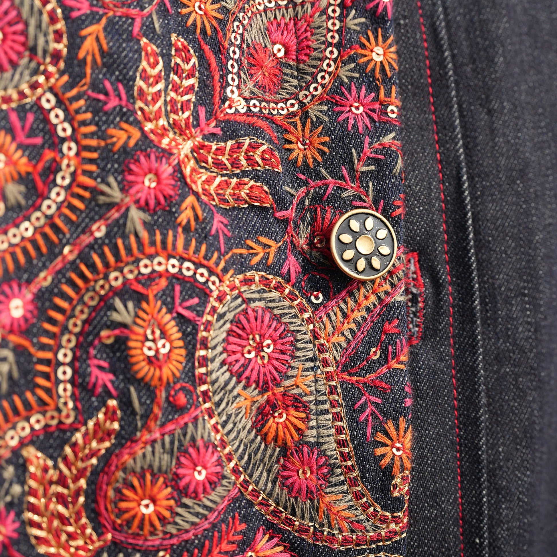 For best results, dry clean only.This garment is crafted with cotton raw denim and may naturally release excess dye in early washes. Please do not machine wash and dry with other laundry you will damage the sequin work in the embroidery.